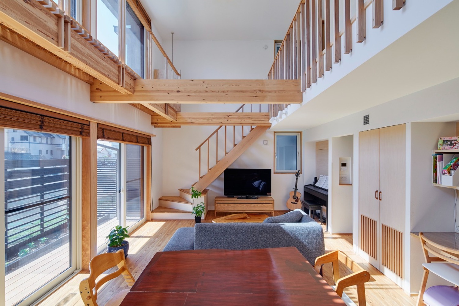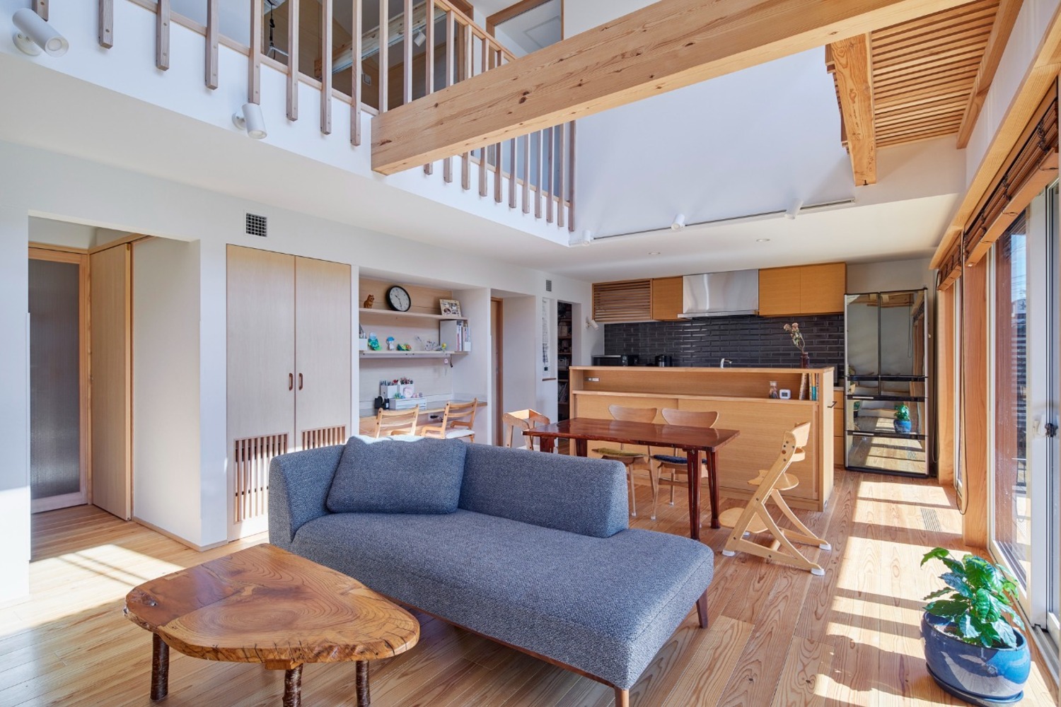 I型に配置したLDKには柱を一切立てず、さらに上部には約12㎡の吹き抜けを設けています。
