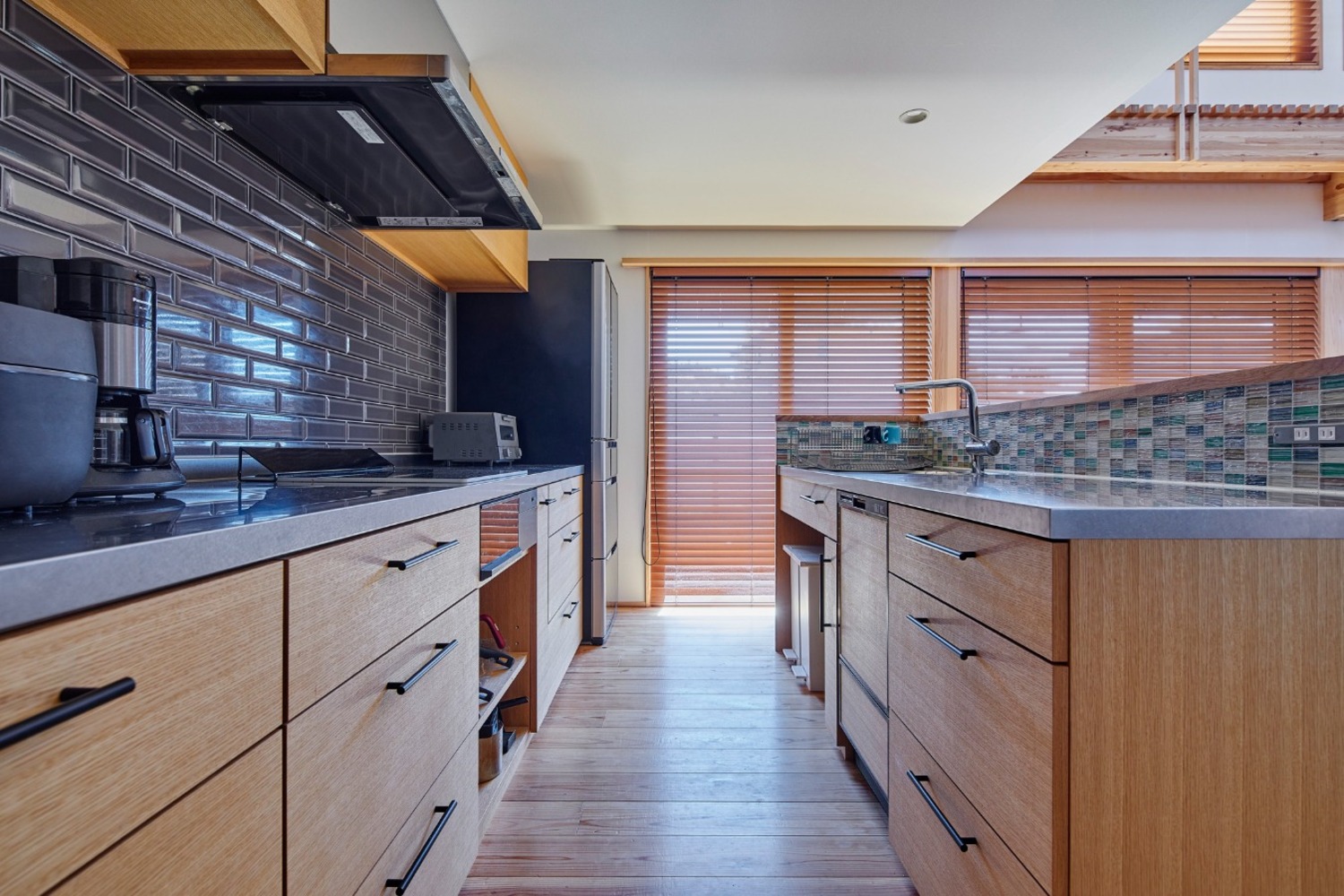 手洗いスペース、キッチンにはそれぞれ形や色の異なるタイルをご選択。木の温もり漂う空間に素敵なアクセントとなっています。