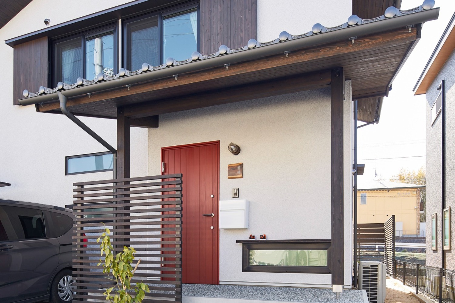 ユダ木工のノルディックレッドの木製玄関ドアが良く映えて素敵なアクセントとなっています。