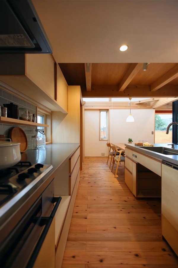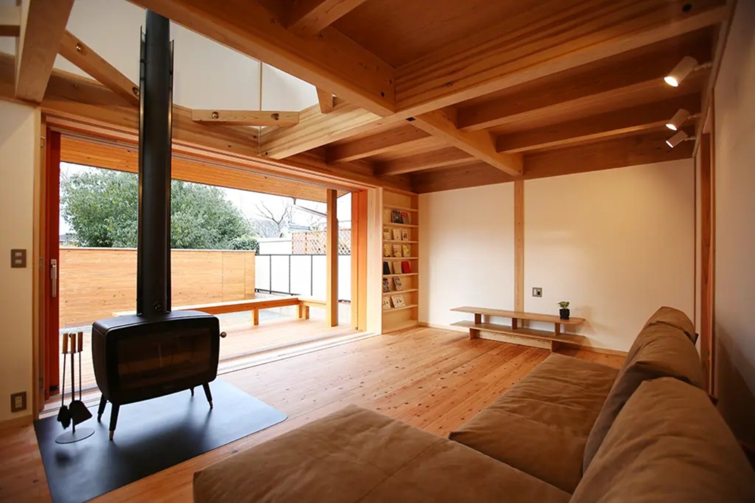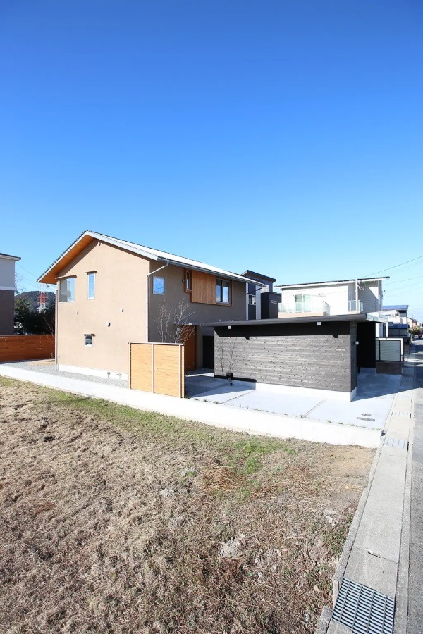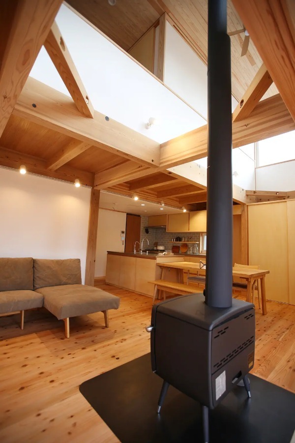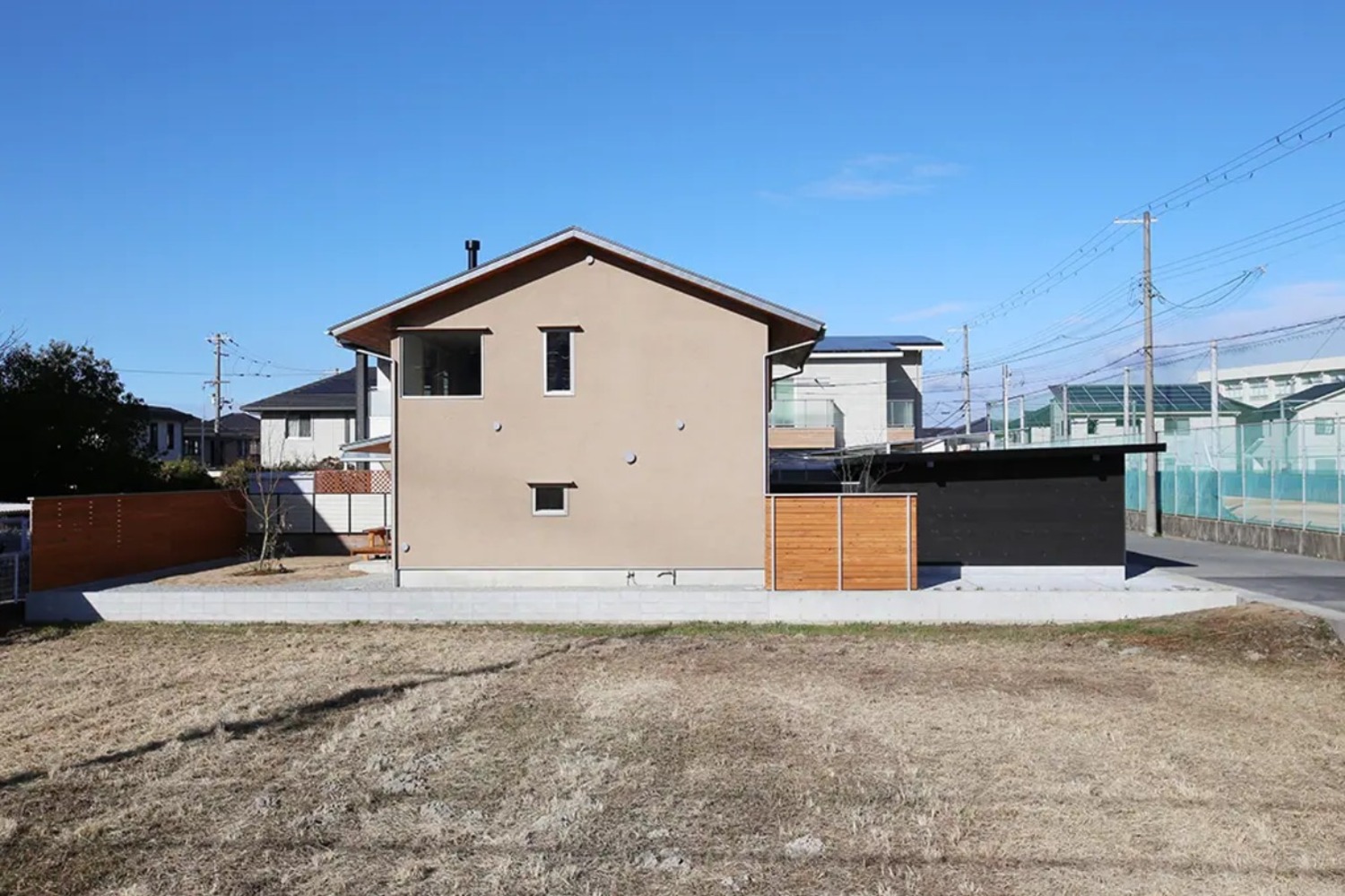 閑静な住宅街の一角。 南北に長い敷地を活かし、大開口と吹抜で開放感溢れるLDKや、行き止まりのない動線と収納により、使いやすく居心地の良い内部空間を実現しています。 また薪ストーブやガレージ、庭などのアウトドア要素も溢れ、家だけでなく敷地全体で愉しめる住まいです。