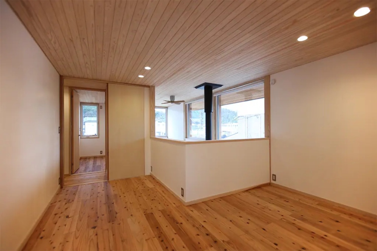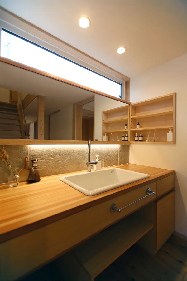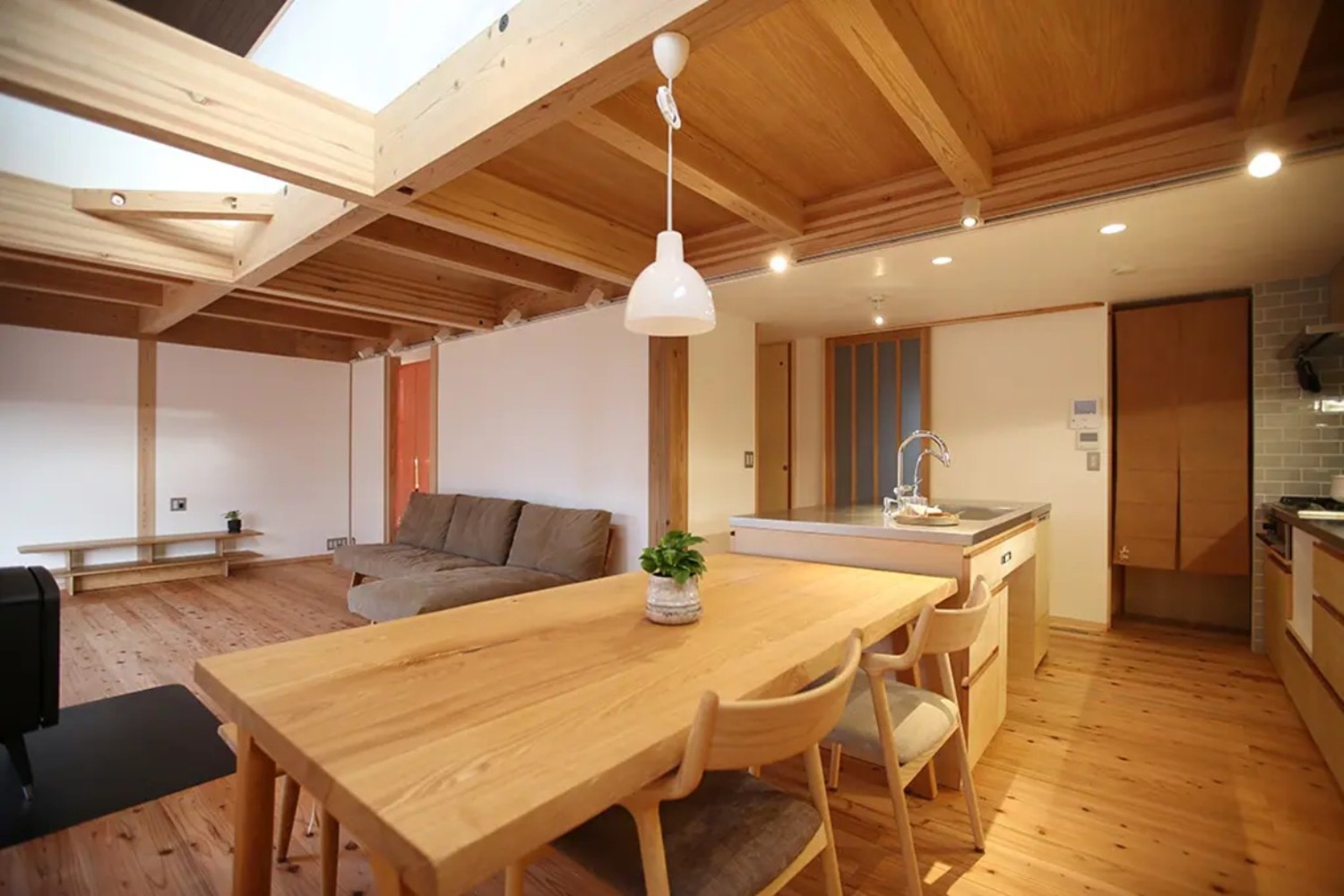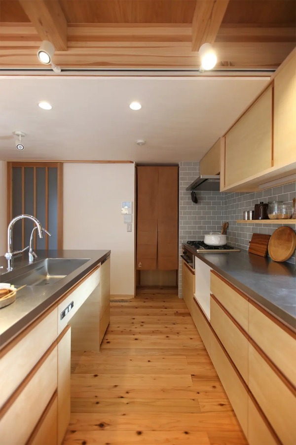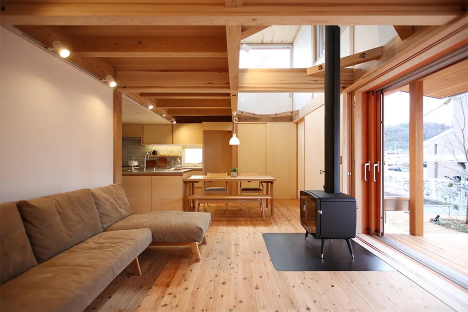 閑静な住宅街の一角。 南北に長い敷地を活かし、大開口と吹抜で開放感溢れるLDKや、行き止まりのない動線と収納により、使いやすく居心地の良い内部空間を実現しています。 また薪ストーブやガレージ、庭などのアウトドア要素も溢れ、家だけでなく敷地全体で愉しめる住まいです。