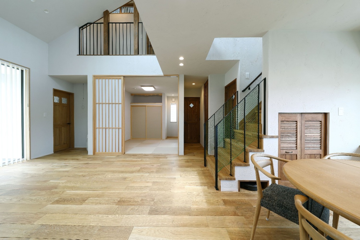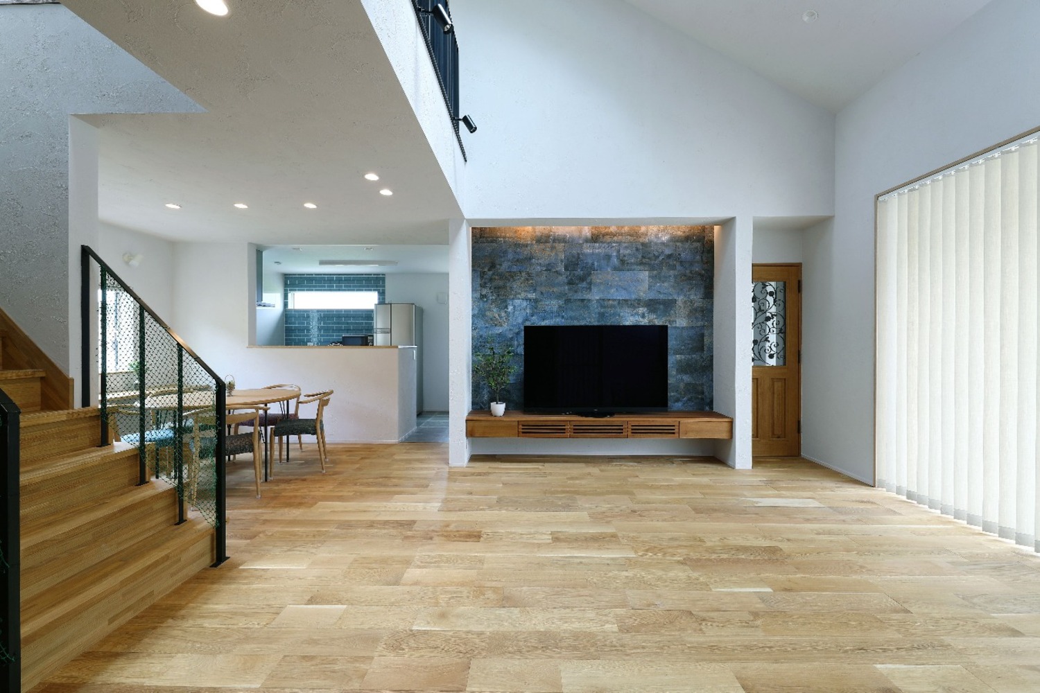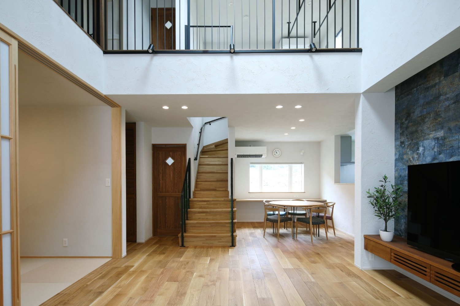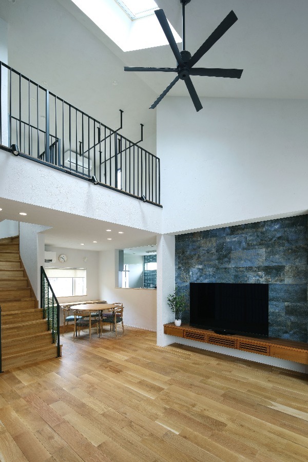 また、多くの現場をご覧になる中で、⾧年憧れていた吹き抜けも実現。トップライトから自然光がたっぷりと差し込み、時間とともに表情を変える開放的なリビング空間が生まれました。