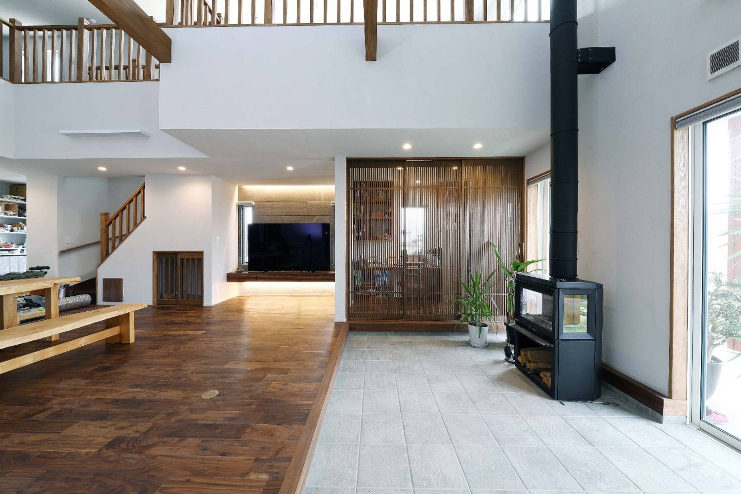 外壁:スーパー白洲そとん壁W W-121/スチロゴテ仕上げ 内装:中霧島壁ライト L-21/コテの目仕上げ