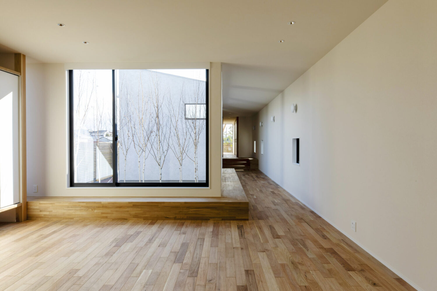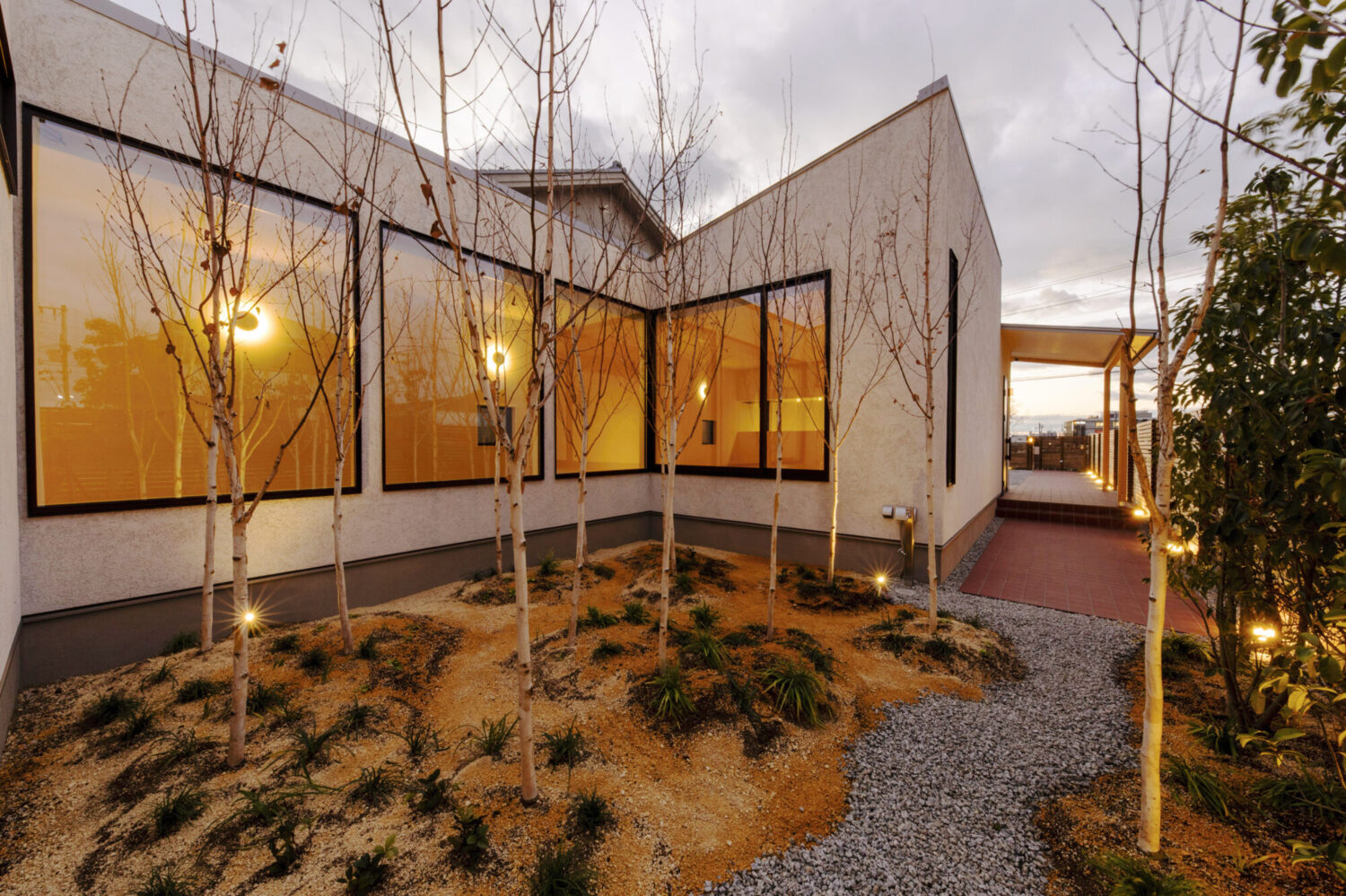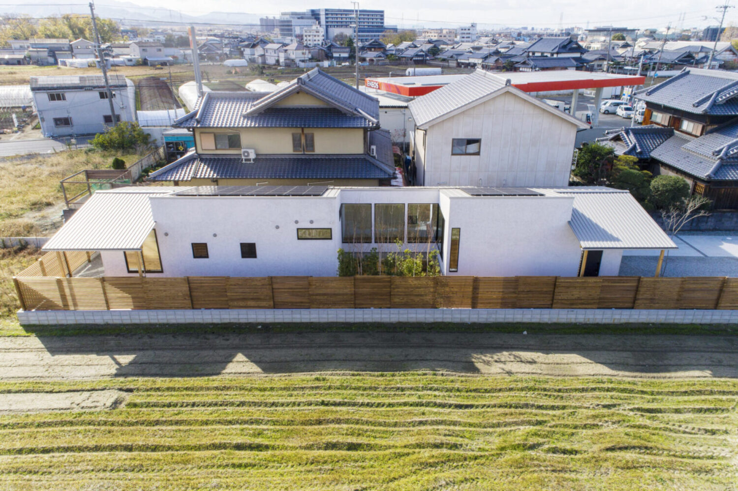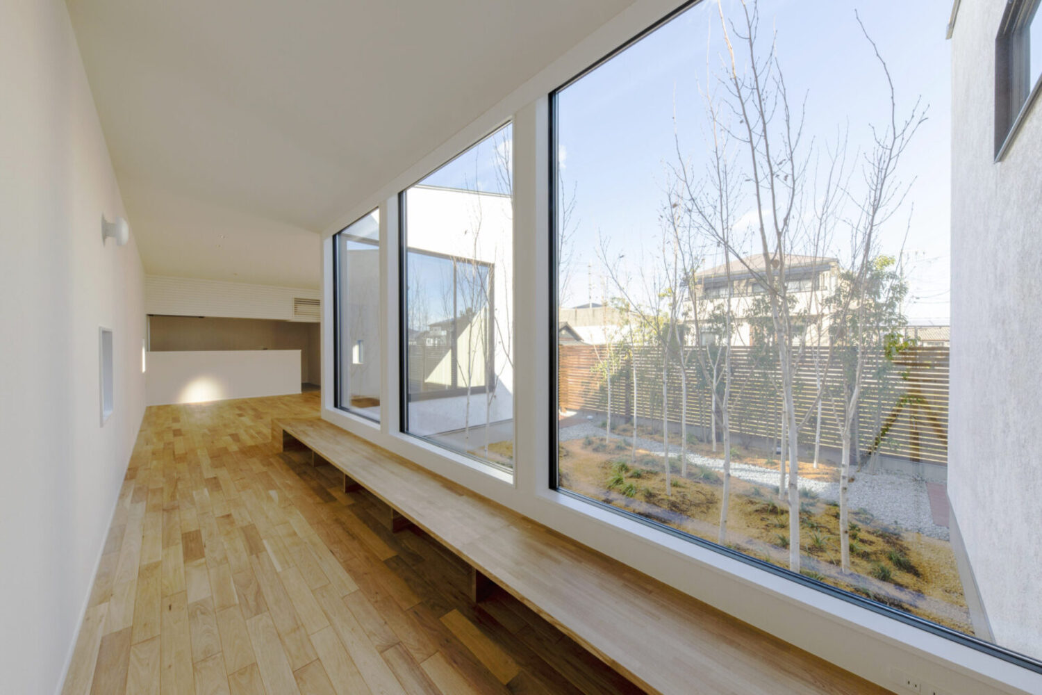 間口約9m、奥行約50mの東西に伸びる敷地に建つ平屋の新築住宅です。この敷地で一番気持ちのよい場所に「みち」をつくり、その「みち」を起点に様々な用途が紐づいていく小さな都市のような建築を考えました。建物は三間×三間のモジュールを基準とした複数のボリュームを組み合わせて構成しています。室内への採光は南側に建物が並んでいるため、北側と、中庭を設けることで東側から取り込む計画としています。中庭も3間×3間で構成し、中庭を挟んだ手前のボリュームをLDK棟とし、奥を寝室棟としました。LDK棟と住居棟とで床のレベルを少し変えることで、空間に変化を持たせています。それにより生まれた様々な居場所が、暮らしに合わせて活躍してくれることを期待しています。