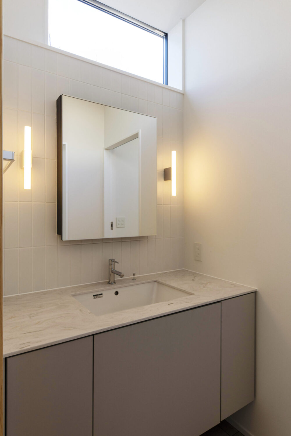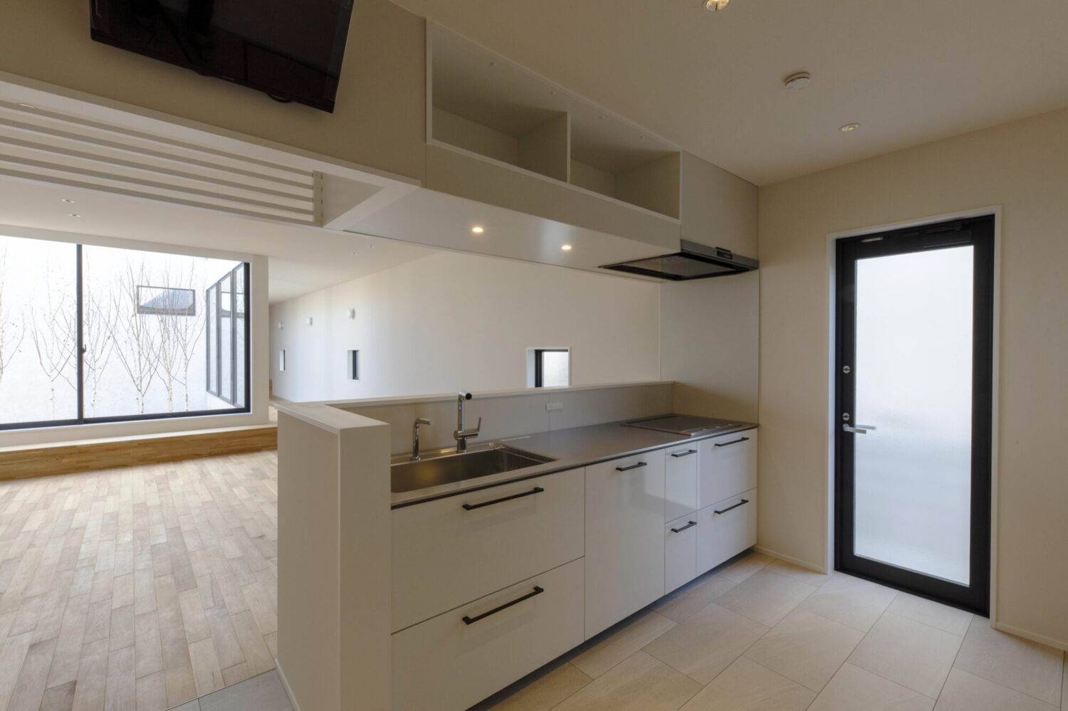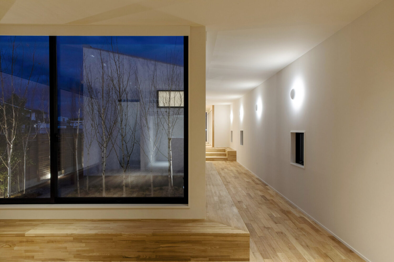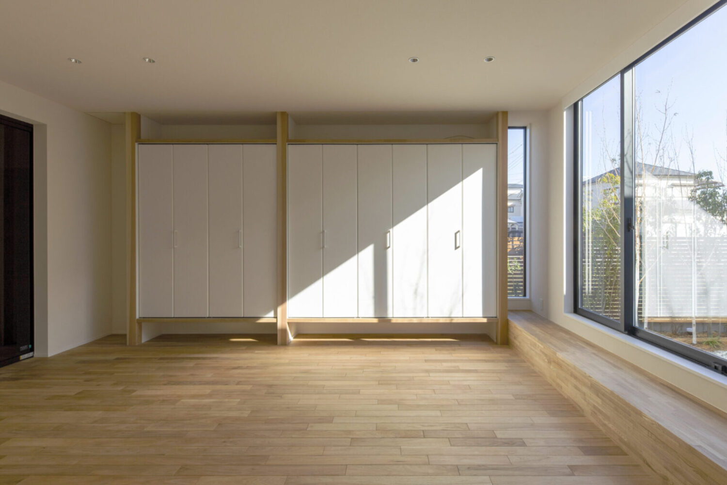 間口約9m、奥行約50mの東西に伸びる敷地に建つ平屋の新築住宅です。この敷地で一番気持ちのよい場所に「みち」をつくり、その「みち」を起点に様々な用途が紐づいていく小さな都市のような建築を考えました。建物は三間×三間のモジュールを基準とした複数のボリュームを組み合わせて構成しています。室内への採光は南側に建物が並んでいるため、北側と、中庭を設けることで東側から取り込む計画としています。中庭も3間×3間で構成し、中庭を挟んだ手前のボリュームをLDK棟とし、奥を寝室棟としました。LDK棟と住居棟とで床のレベルを少し変えることで、空間に変化を持たせています。それにより生まれた様々な居場所が、暮らしに合わせて活躍してくれることを期待しています。