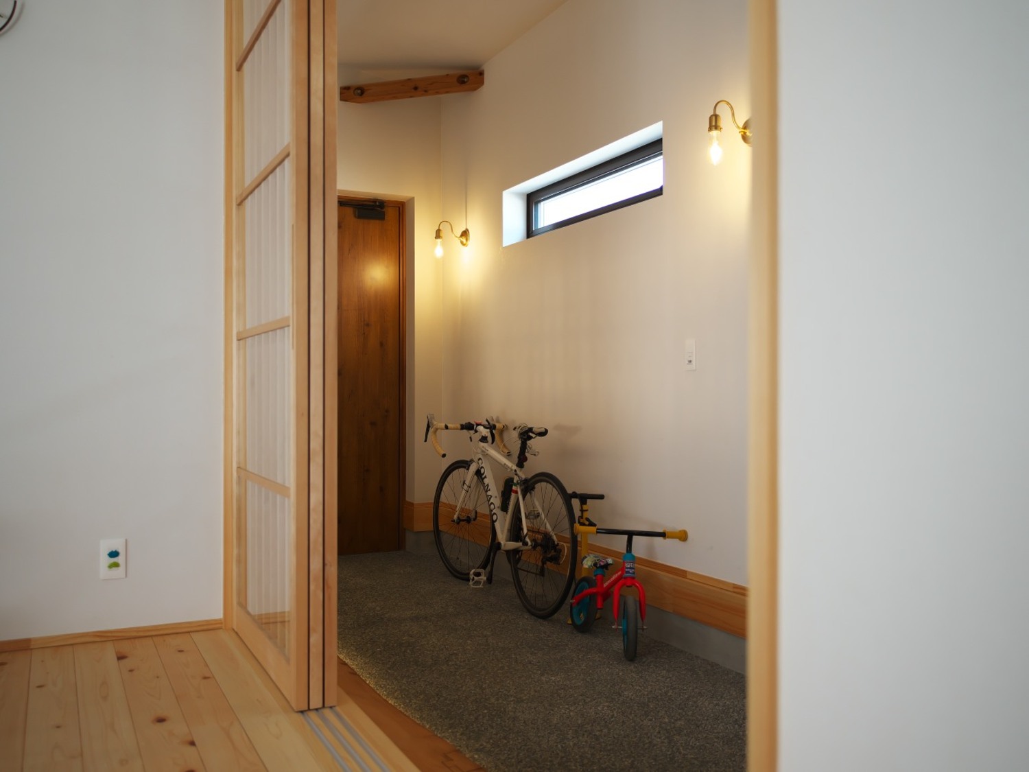 玄関の扉を開けると、深い味わいと風合いを持つ長い土間が広がります。