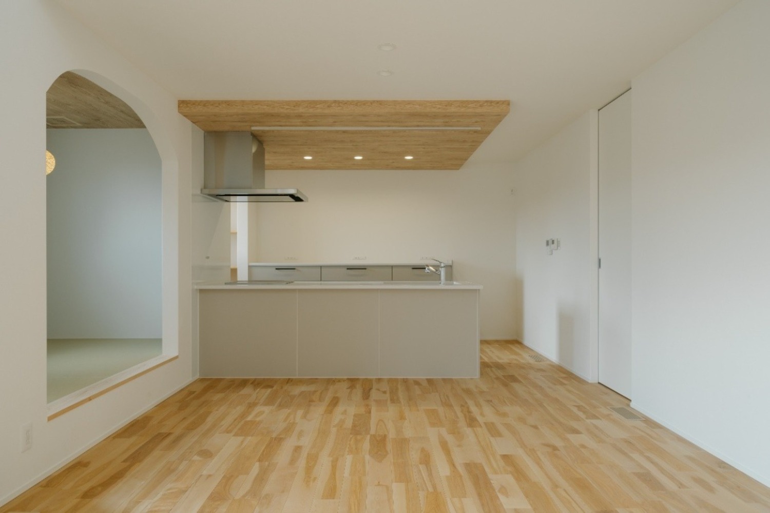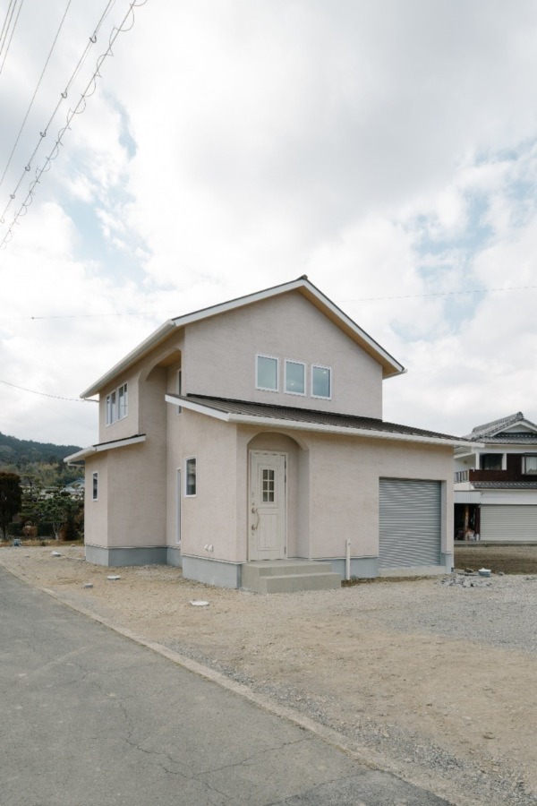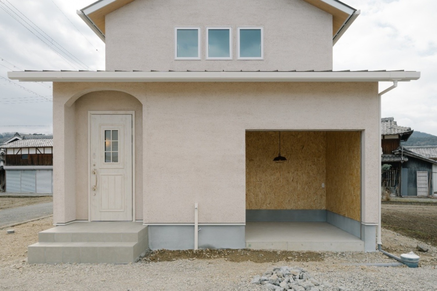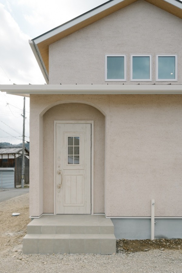 『おとぎの家』は、やわらかなピンクベージュのそとん壁を纏い、北欧テイストの外観に仕上げました。そとん壁といえば和風なイメージを持たれると思いますが、明るい色合いを選ぶことでナチュラルで可愛らしい雰囲気を演出。玄関まわりに設けたアール壁が、やさしい印象と遊び心を添えています。まるで絵本から飛び出したような愛らしい佇まいが、ご家族様の毎日を温かく包み込む住まいとなりました。