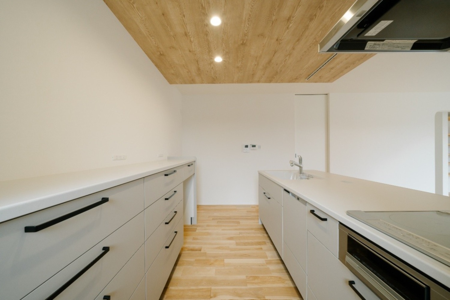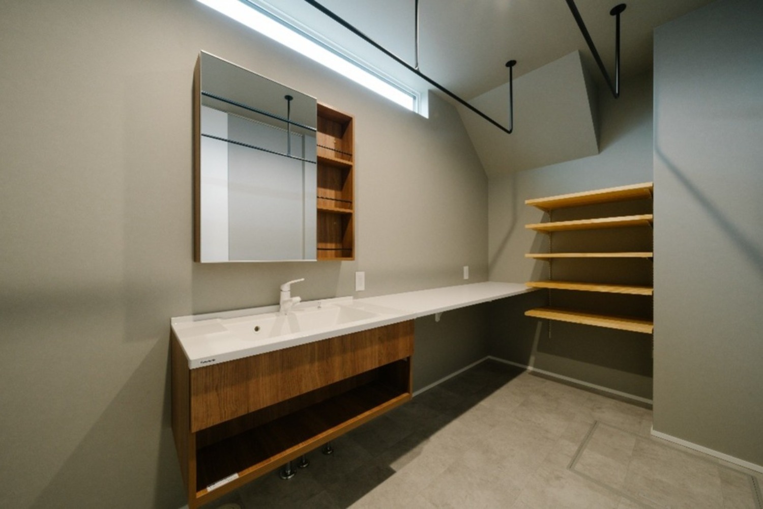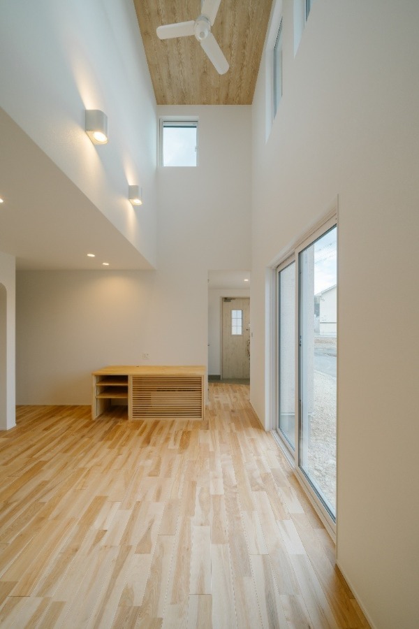 『おとぎの家』は、やわらかなピンクベージュのそとん壁を纏い、北欧テイストの外観に仕上げました。そとん壁といえば和風なイメージを持たれると思いますが、明るい色合いを選ぶことでナチュラルで可愛らしい雰囲気を演出。玄関まわりに設けたアール壁が、やさしい印象と遊び心を添えています。まるで絵本から飛び出したような愛らしい佇まいが、ご家族様の毎日を温かく包み込む住まいとなりました。
