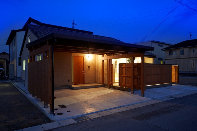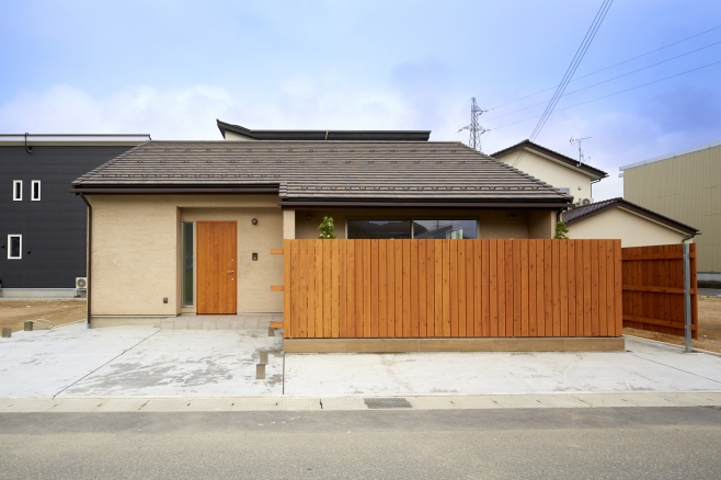 道路に面した南側に配した板張りの目隠しと平屋のつくりが印象的な外観です。