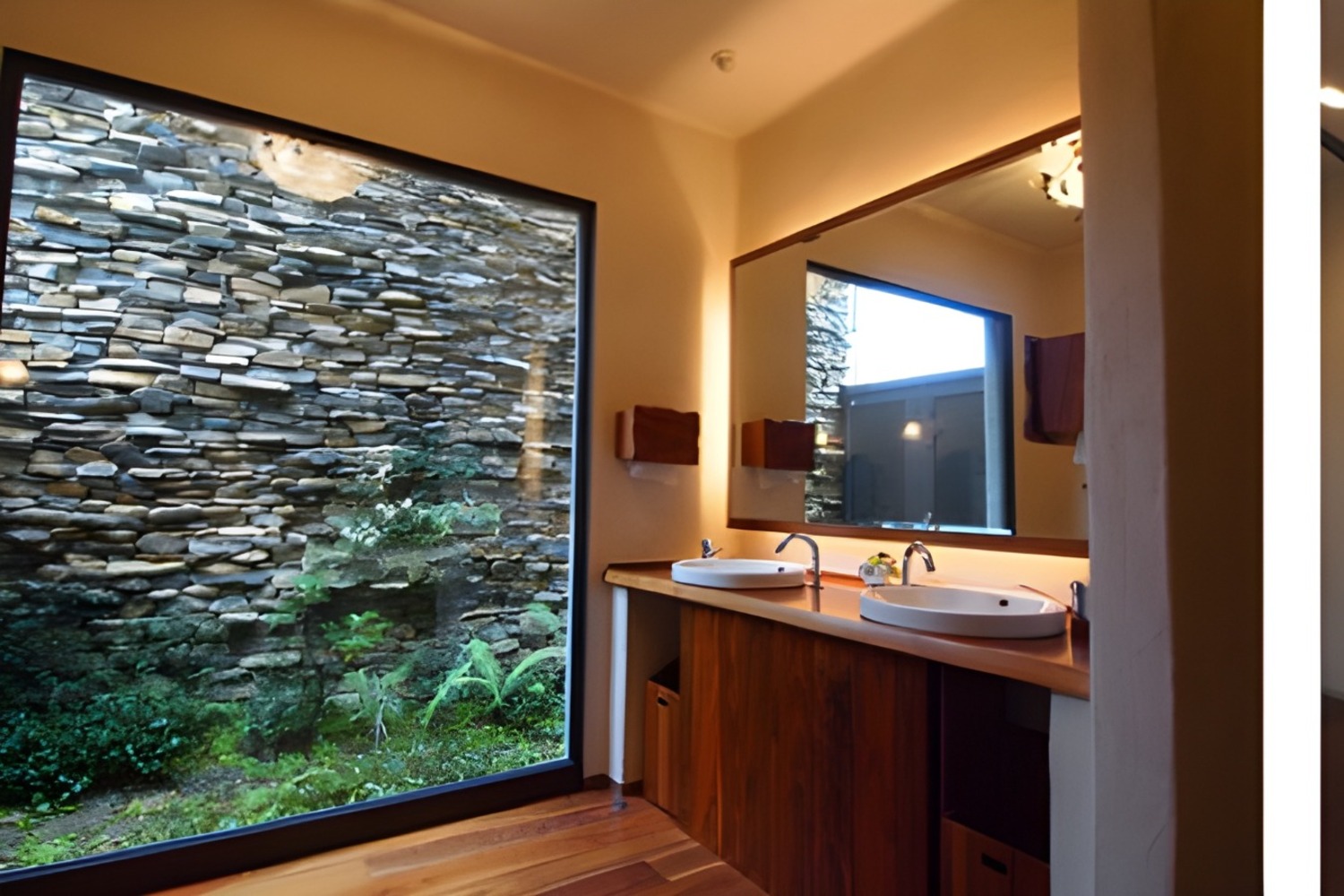 大きな開口部から差し込む光と照明により、シラス壁の表情を愉しむことができます。