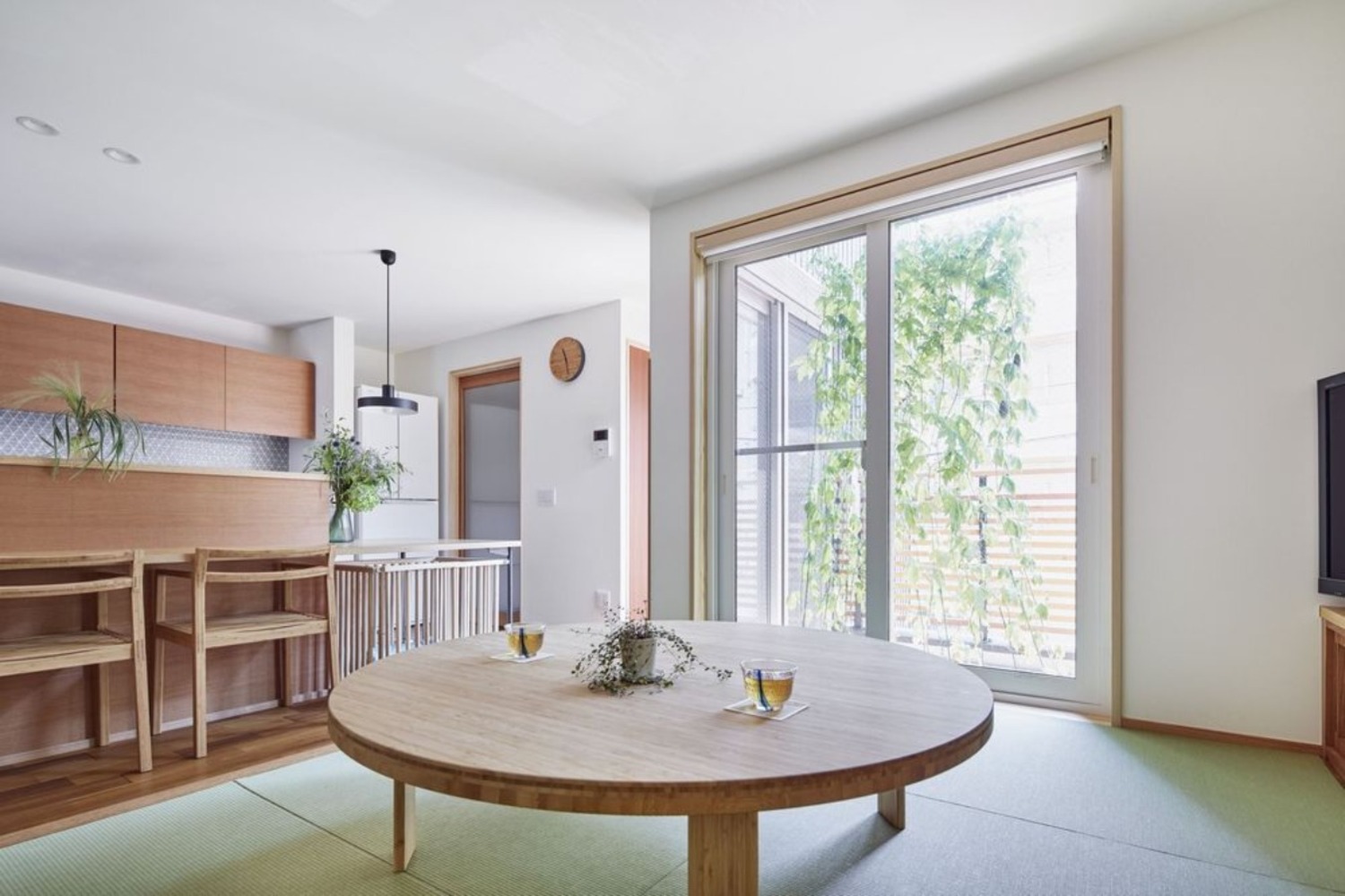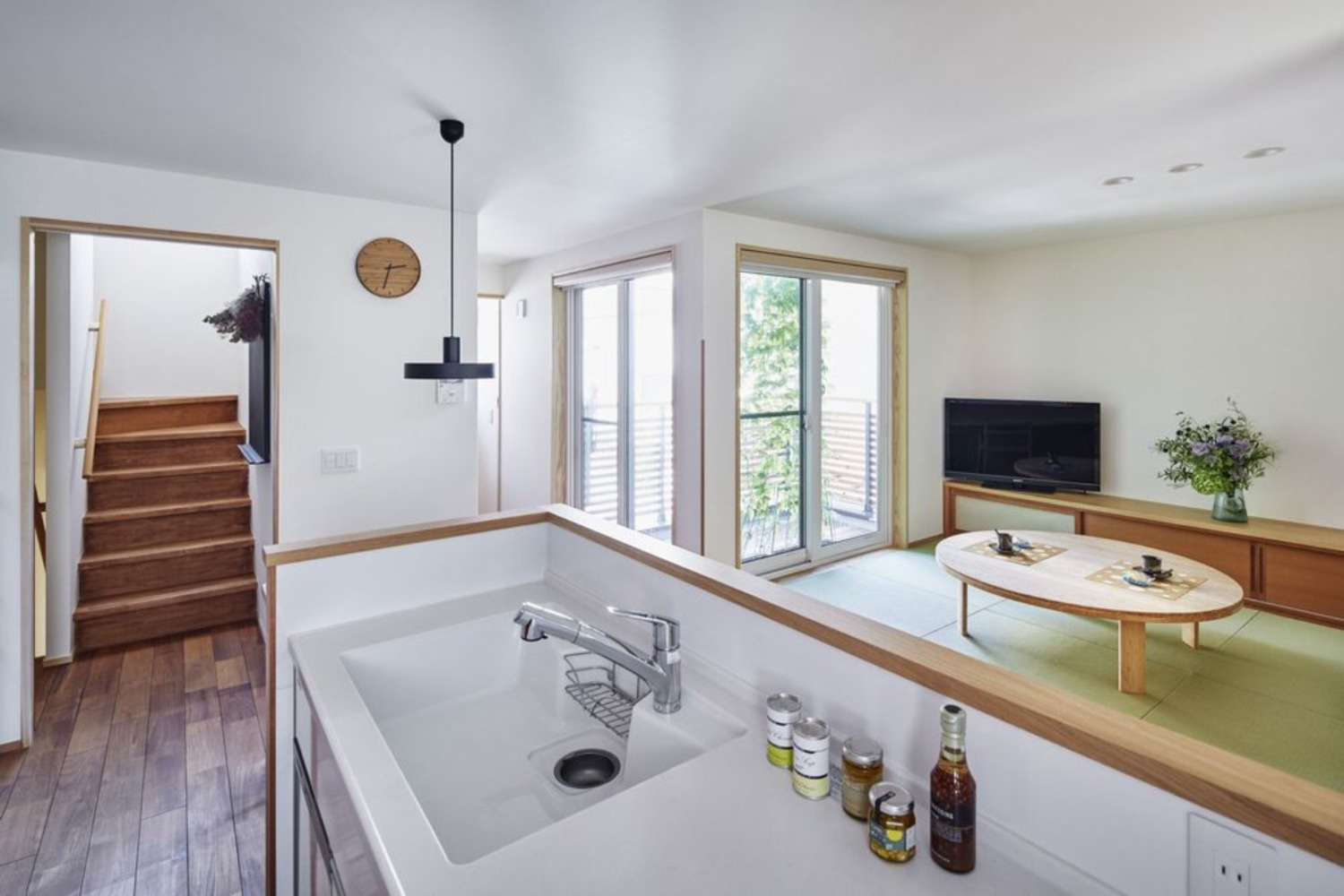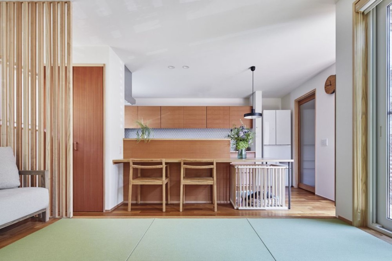 二世帯の暮らしをつなぐために、LDKは2階に配置し、バルコニーをL型のプランで囲い空間の認識が外へと広がるようご提案。リビングは小上がりの畳コーナーという形で配置し、畳でもソファーでもゆっくりとくつろぐことが可能です。また、ミニチュア・ダックスフントと一緒に暮らすF様のために、キッチン横に造作したダイニングカウンターの下をワンちゃんスペースとしても活用しています。
