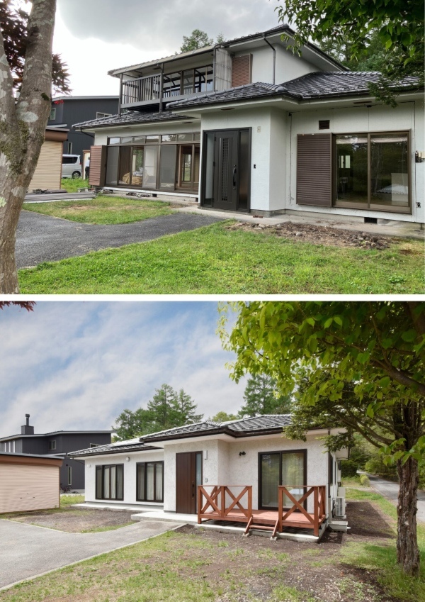 上:リノベ前、下:リノベ後(外壁:スーパー白洲そとん壁W W121スチロゴテ仕上げ)