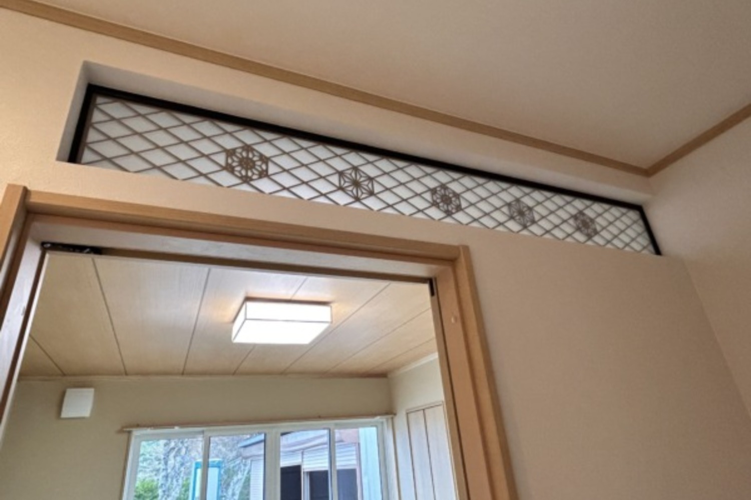 和室の入り口の壁に組み込まれた欄間は、以前の家のもの。