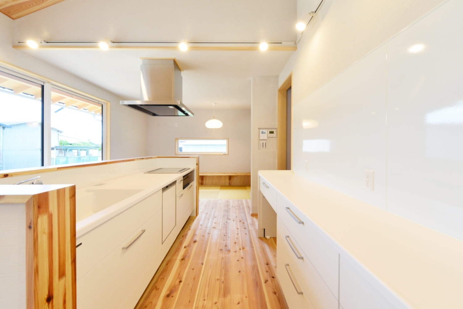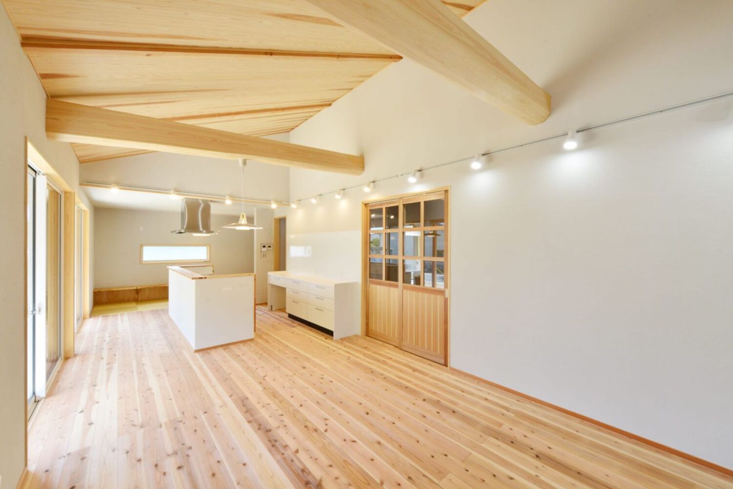中に入ってすぐ目に入る圧巻の太鼓梁と、奥まで見渡せる東西に延びたLDKはご夫婦のこだわりが詰まった空間になっています。