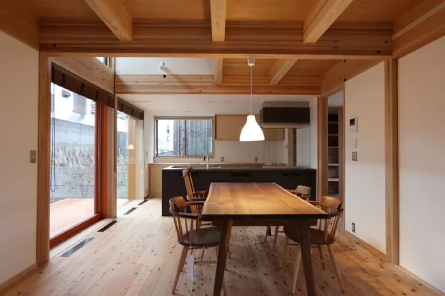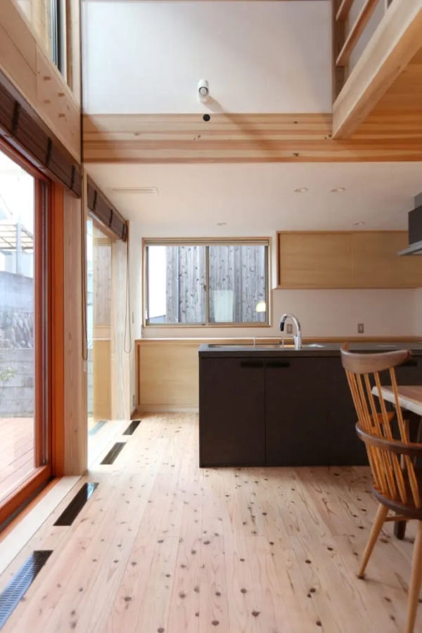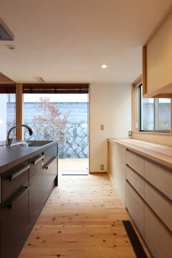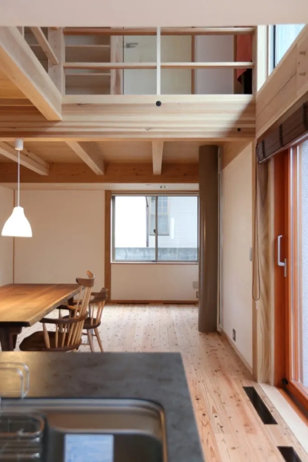 光と空を取り入れる大きな吹き抜けのふもとには、奥さまこだわりのキッチンを。 吹き抜けの傍にはご主人の読書スペースとアトリエを。 家に居ながら色んな空が見える、家族のこだわりが詰まった第二の故郷です。