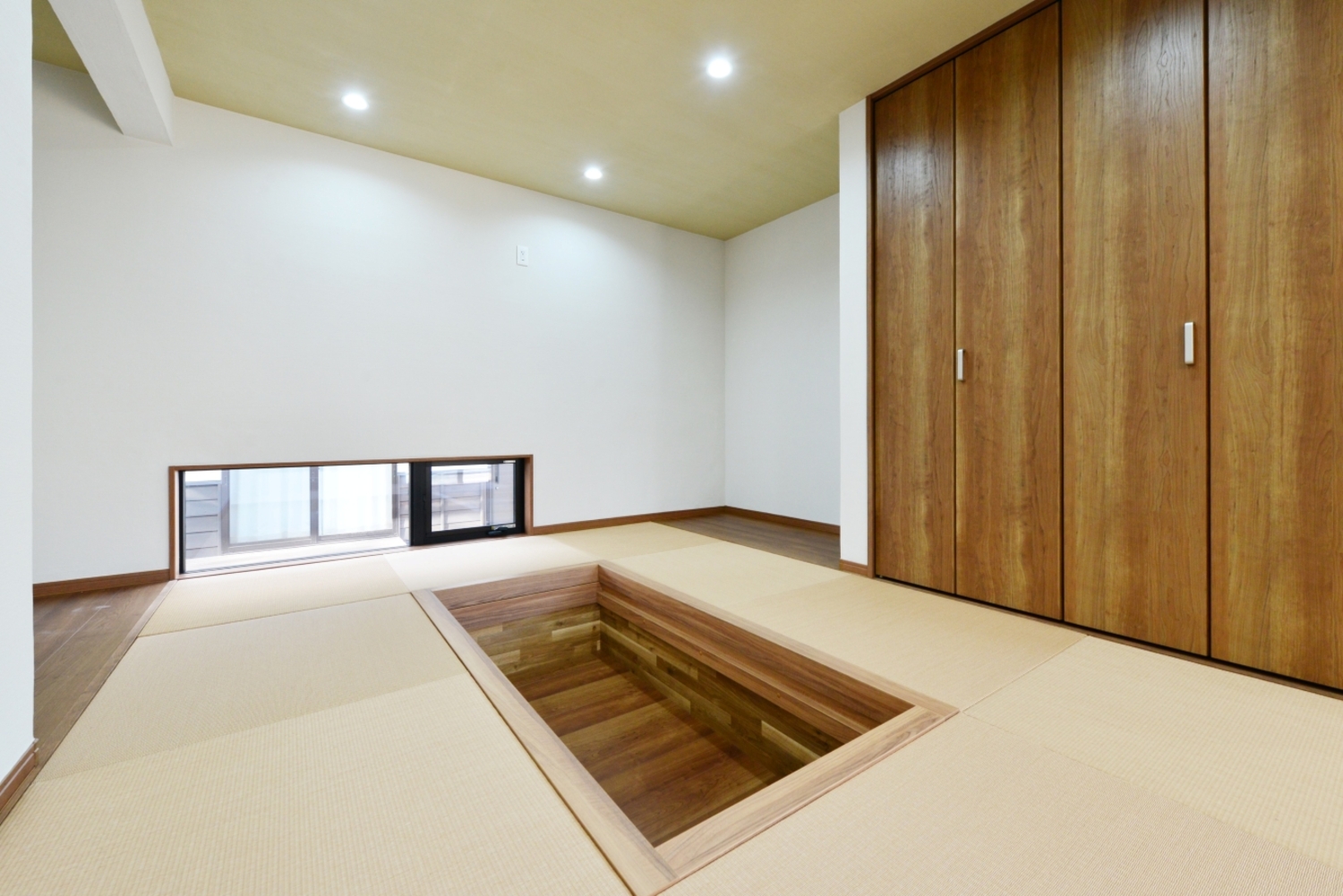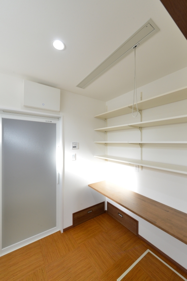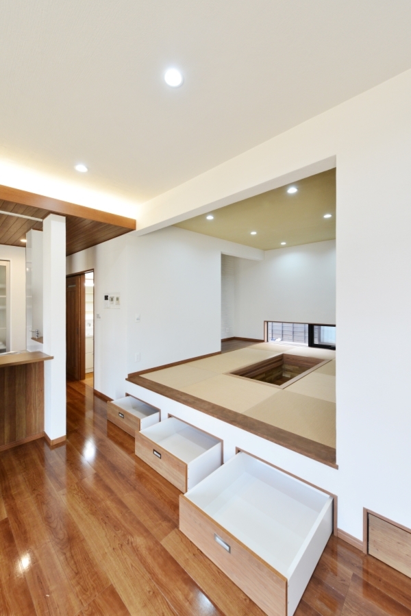 小上がりの床下部分を収納にして、リビング側と洗面室からと引き出せるようになっています。