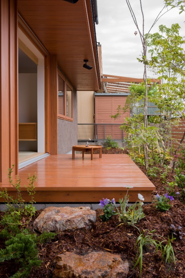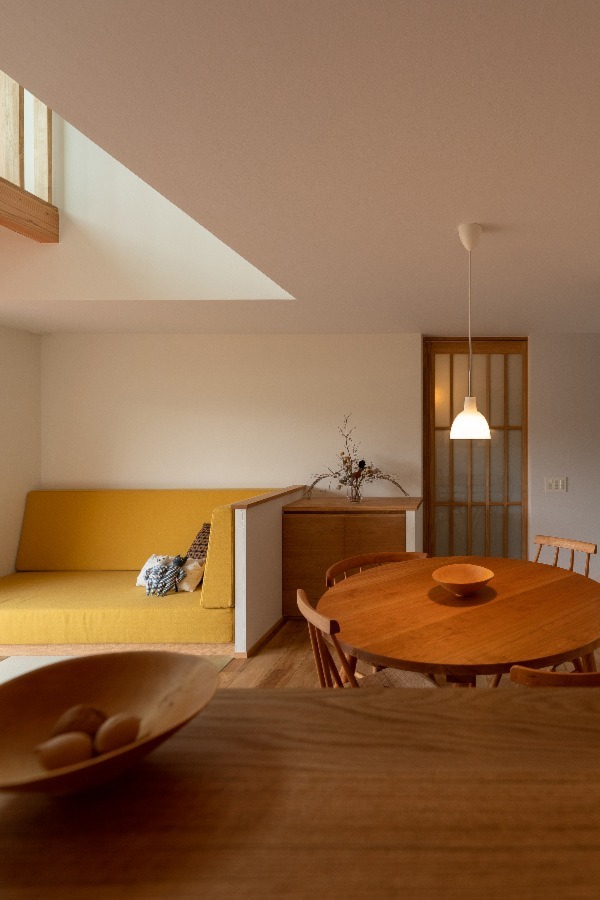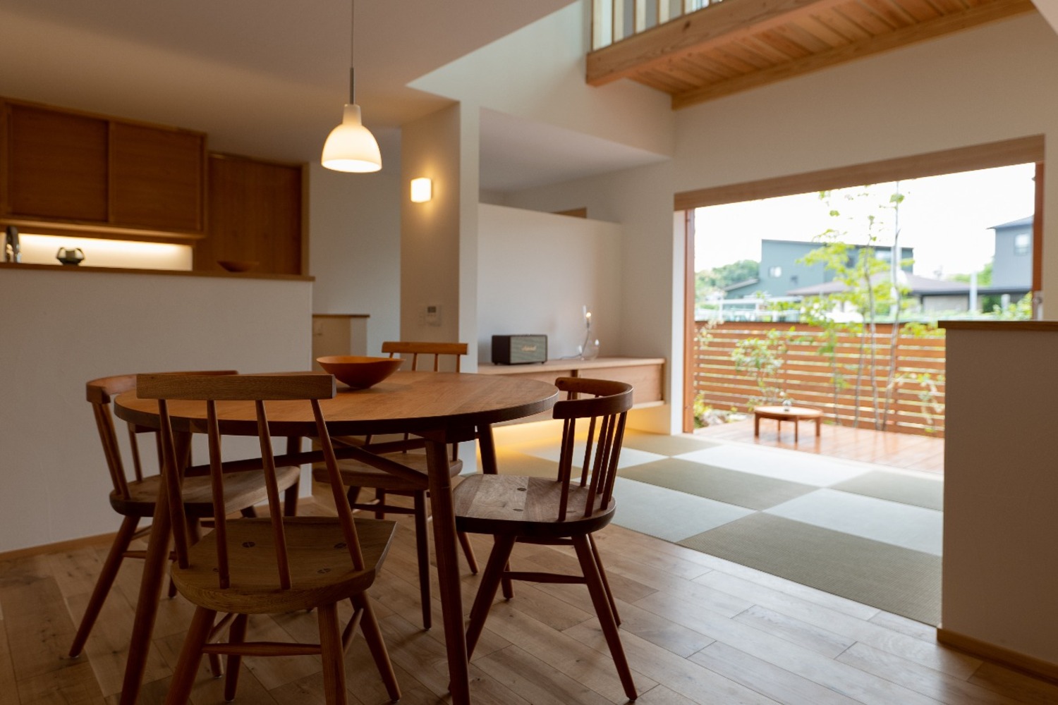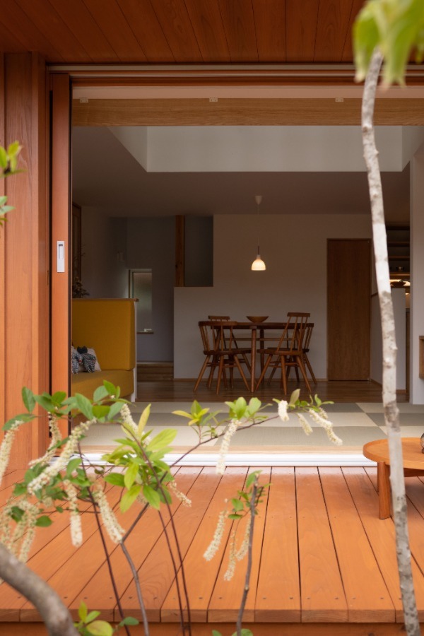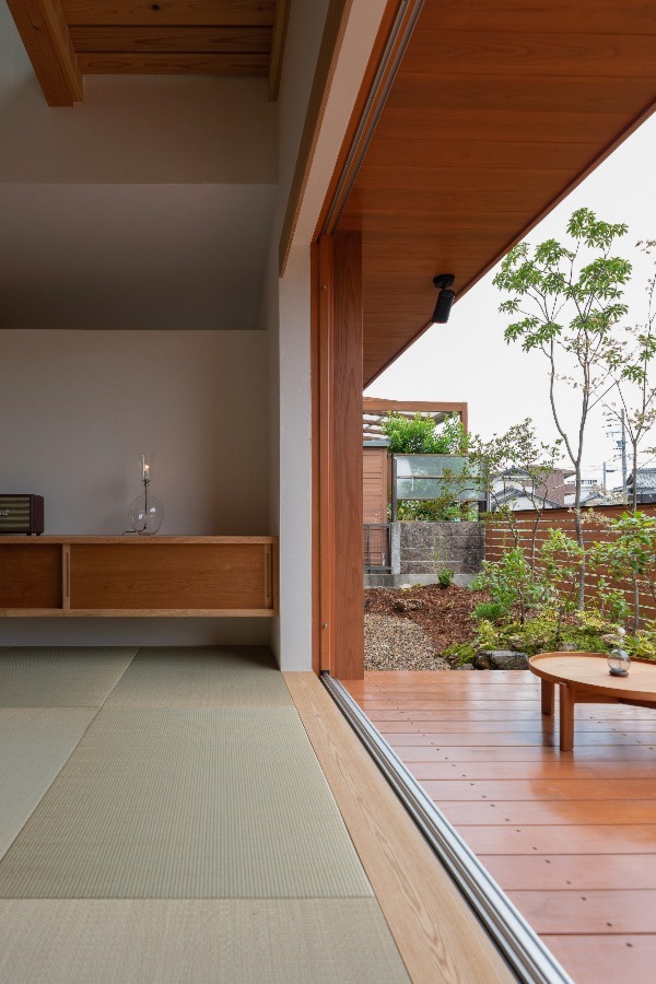 住宅密集地に庭と共に暮らす、立体的な一体空間のある2階建て