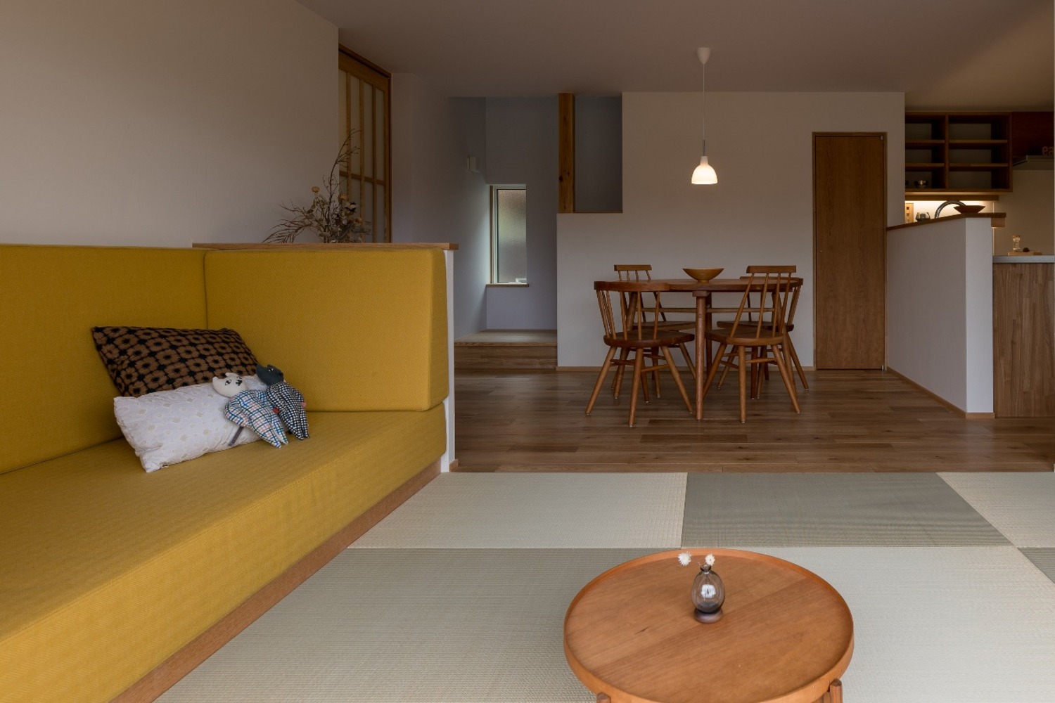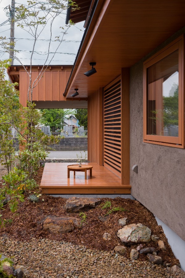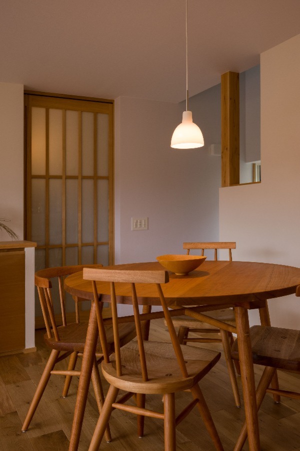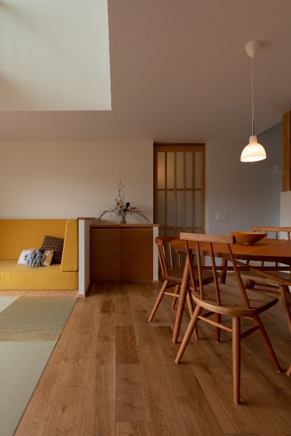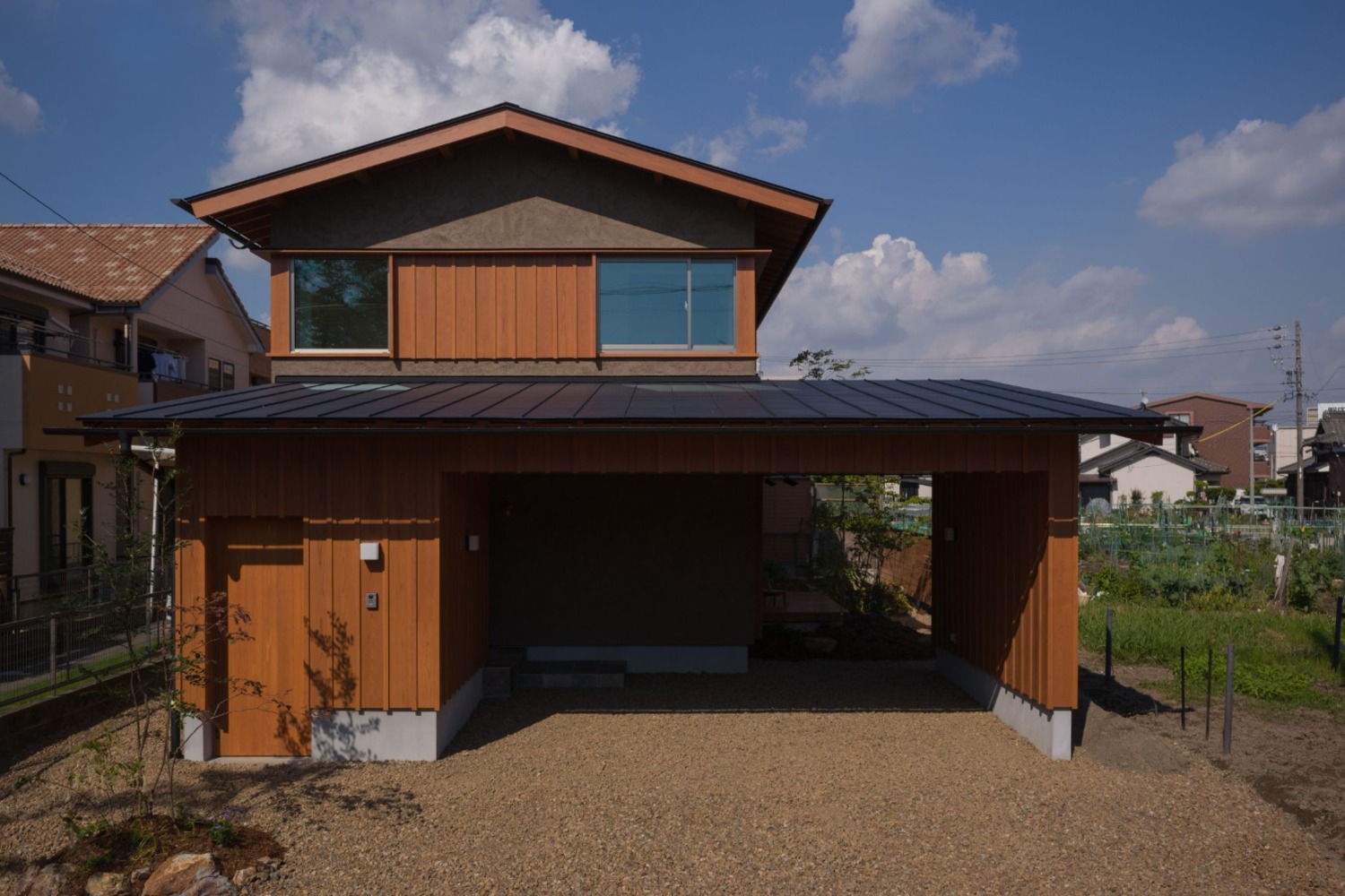 住宅密集地に庭と共に暮らす、立体的な一体空間のある2階建て
