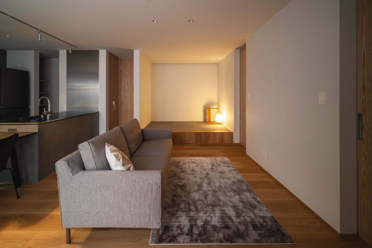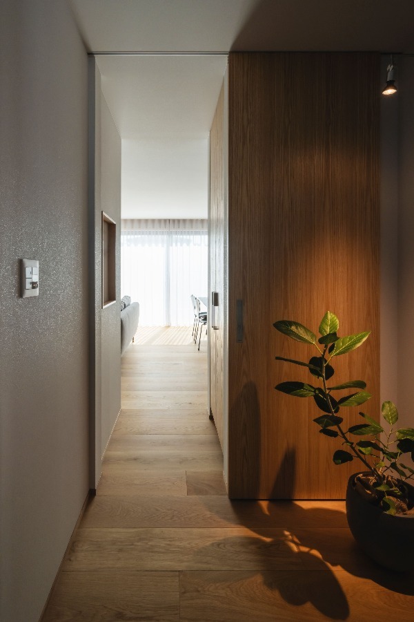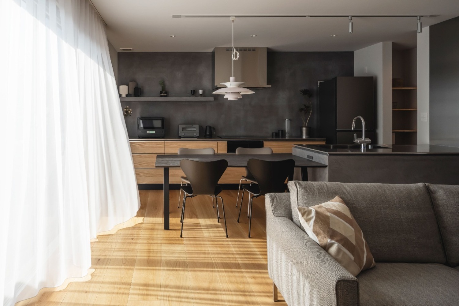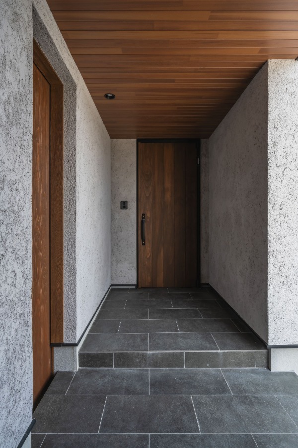 そとん壁の外壁、木製造作建具やモールテックスの造作キッチンなど、自然素材を多く採用した心地の良い住まいです。