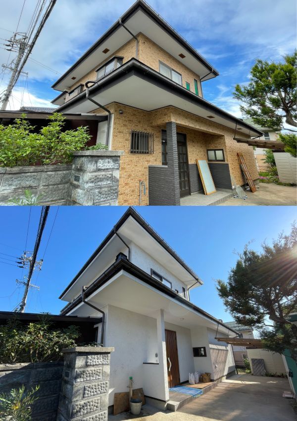 上:施工前、下:施工後 外壁:スーパー白洲そとん壁W W-121 スチロゴテ仕上げ
