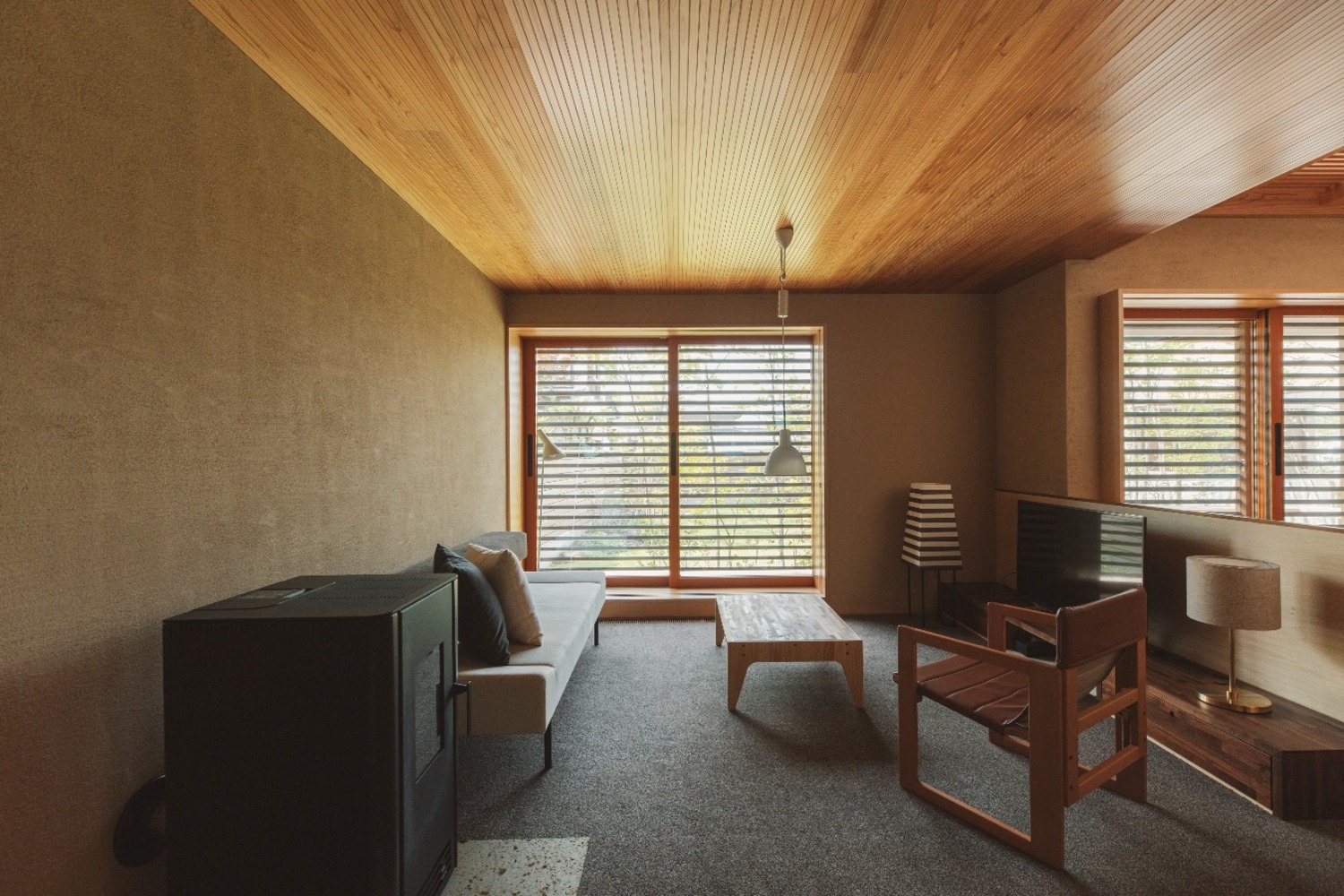 室内壁には薩摩中霧島壁、床や造作家具には無垢材、内外装のほぼすべてを自然素材で仕上げることで、