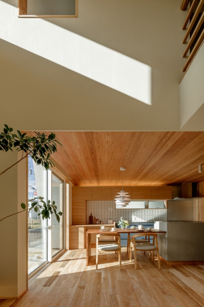 「気持ちの良い朝日を浴びながら1日が始まります。公園がある南面に大きな窓を設けて、冬は暖かい日差しを取り入れ、夏は大きく出した屋根や庇が暑い日差しをカットしてくれます。室内からは公園の奥に広がる山の景色を四季の移ろいを感じながら楽しんでいます。」