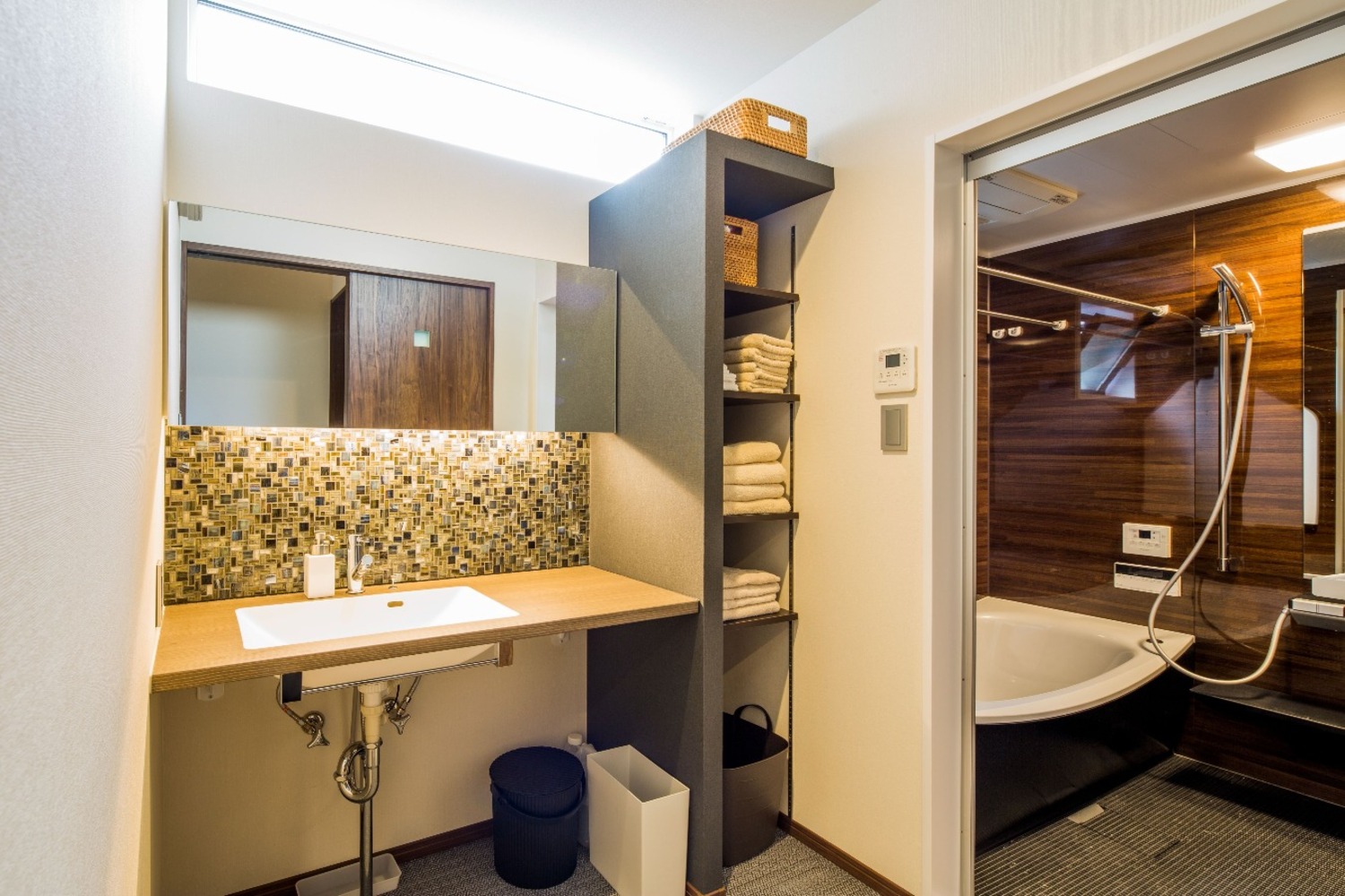 浴室・洗面は1階の寝室の近くに設け、洗濯機スペースはあえて離して2階のキッチンに隣接する収納内に設置。