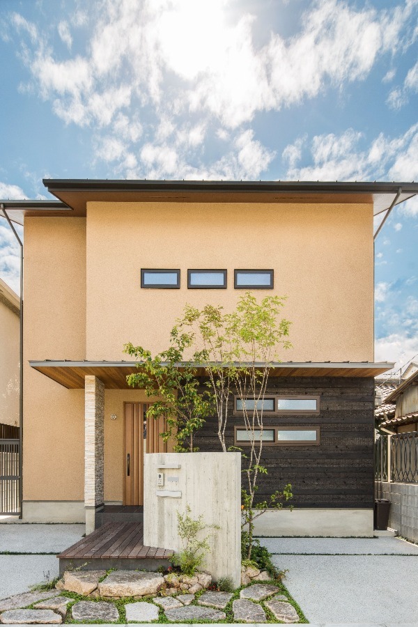 外観はそとん壁と焼杉・タイルと異素材を組み合わせ、和の雰囲気を残しつつシンプルな外観。